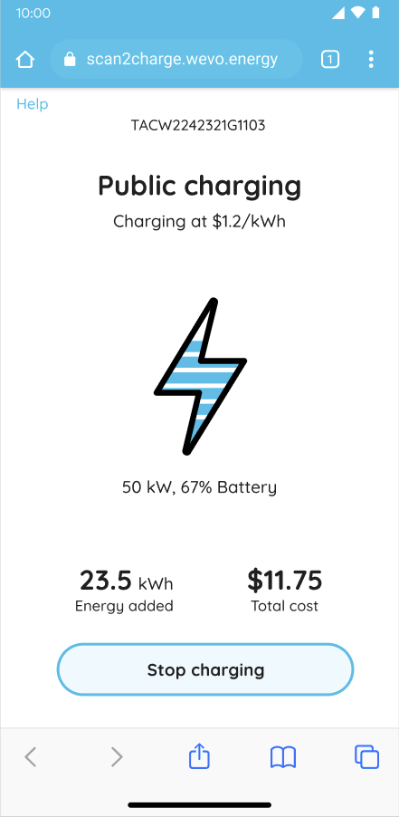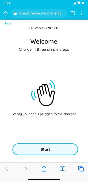 1. Scan the QR Code on the EV Charger. This will take you to a welcome page in your web browser, no App required. Verify that your car is plugged in, then tap “Start”