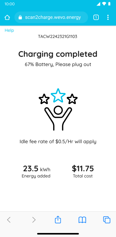 8. Charging is complete and it is now safe to unplug your vehicle. You will receive a link to the receipt via SMS.